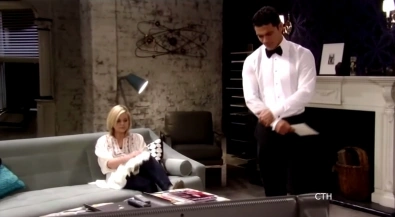 The next morning, Nathan and Maxie wake up in bed together and continue making love. Afterwards, Maxie asks Nathan if he was tutored in the art of seduction like he was tutored in french because he knows how to dazzle her. He says "Non. C'set un cadeau" to her and when she asks what that means he says it means "it's a gift" and she says that she has gift for him - her lips and then they kiss. Nathan pulls away and Maxie thinks it's because she has morning breath but he says no, he likes the way she tastes but he needs 20 minutes to recharge. She tells him not to scare her like that and that sometimes a kiss is just a kiss. He asks if this is one of those times and she says no. Later, Nathan comes out of the kitchen, in his underwear, with breakfast and Maxie comes in and asks him what he's doing; he says they needed sustenance. She says she can't believe he's cooking and he says he does dishes too, but says that she can handle that. She says she would gladly scour all the pots and pans that she owns if he promises to do all of the cooking in his underwear. He says if she keeps staying the night, he will keep doing the cooking. Then Maxie points out that this is her apartment and Nathan says good point. Maxie looks at him and says she's wondering if it's been 20 minutes yet and jumps on him, spilling all the food.